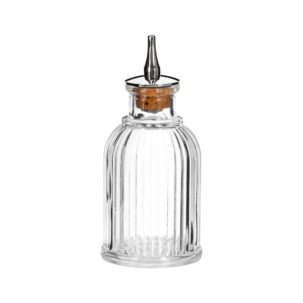 Dispensador de endulzante líquido de vidrio con textura. Tiene una capacidad de 90 ml. Tiene un tamaño de 5.6x12,8 cm.