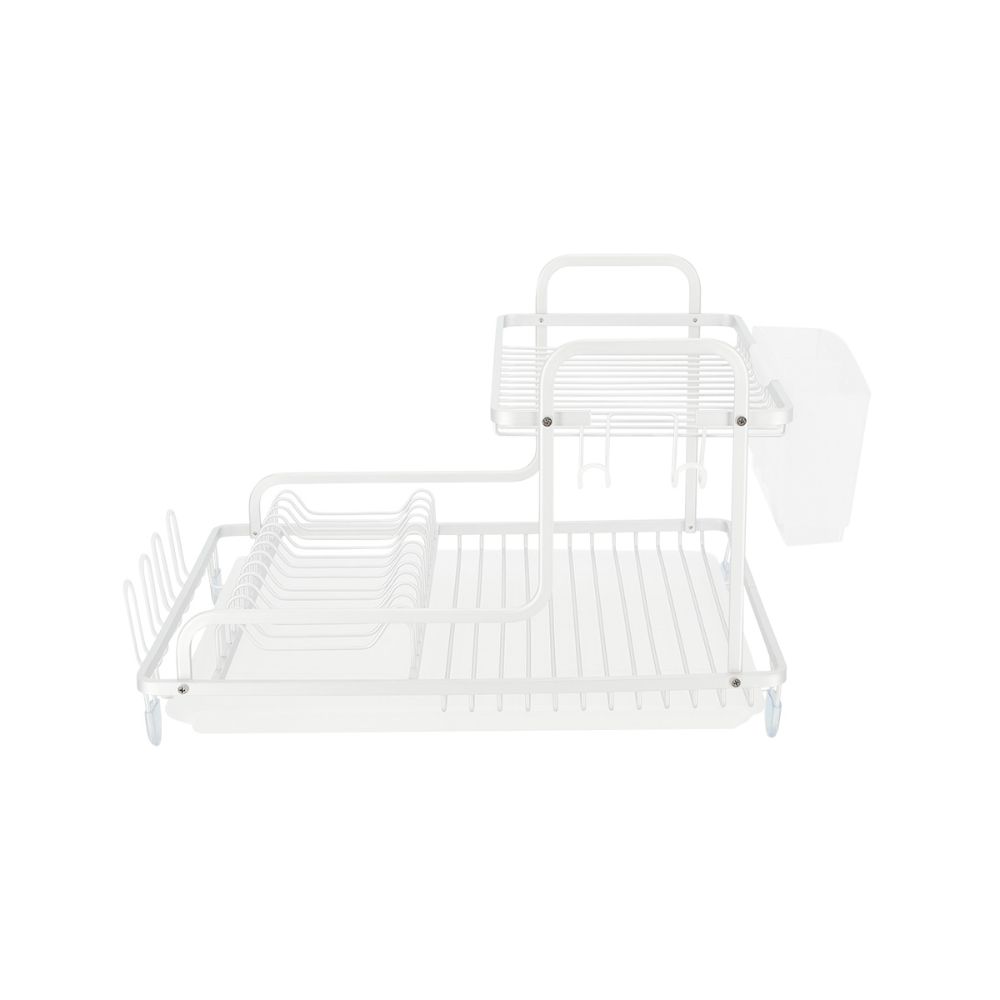 Escurridor de aluminio. Posee patas antideslizantes, bandeja desmontable e incluye ganchos para colgar vasos, Tazas, jarras o copas. Además, tiene un escurridor de cubiertos rubber y un segundo nivel para vasos, copas, jarras u ollas. Este producto requiere armado (trae instrucciones). Tiene una capacidad de 13 Platos y medidas de 57,5x35x27 cm.
