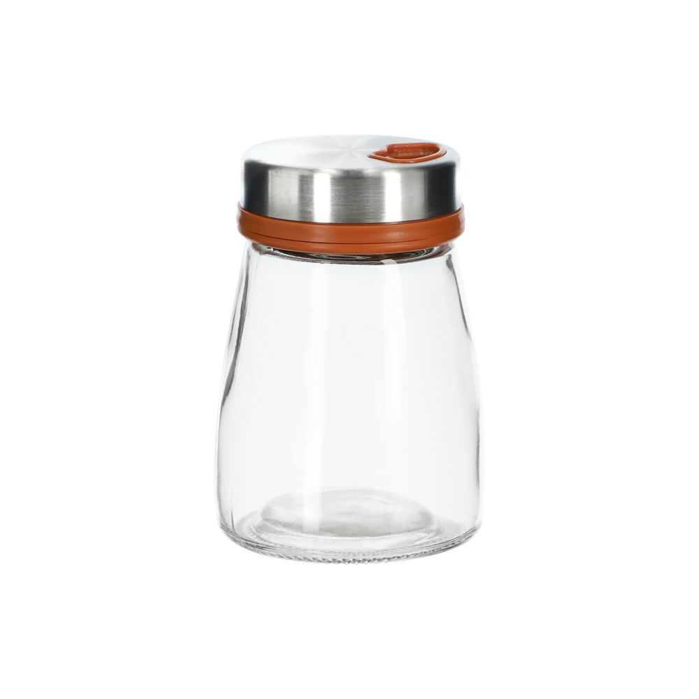 Especiero de vidrio con tapa de acero. Tiene una capacidad de 190 ml.