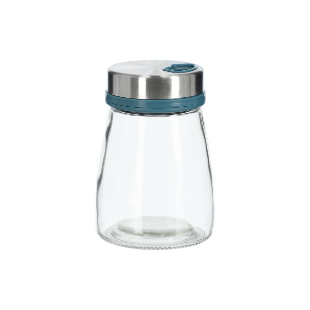 Especiero de vidrio con tapa de acero. Tiene una capacidad de 190 ml.