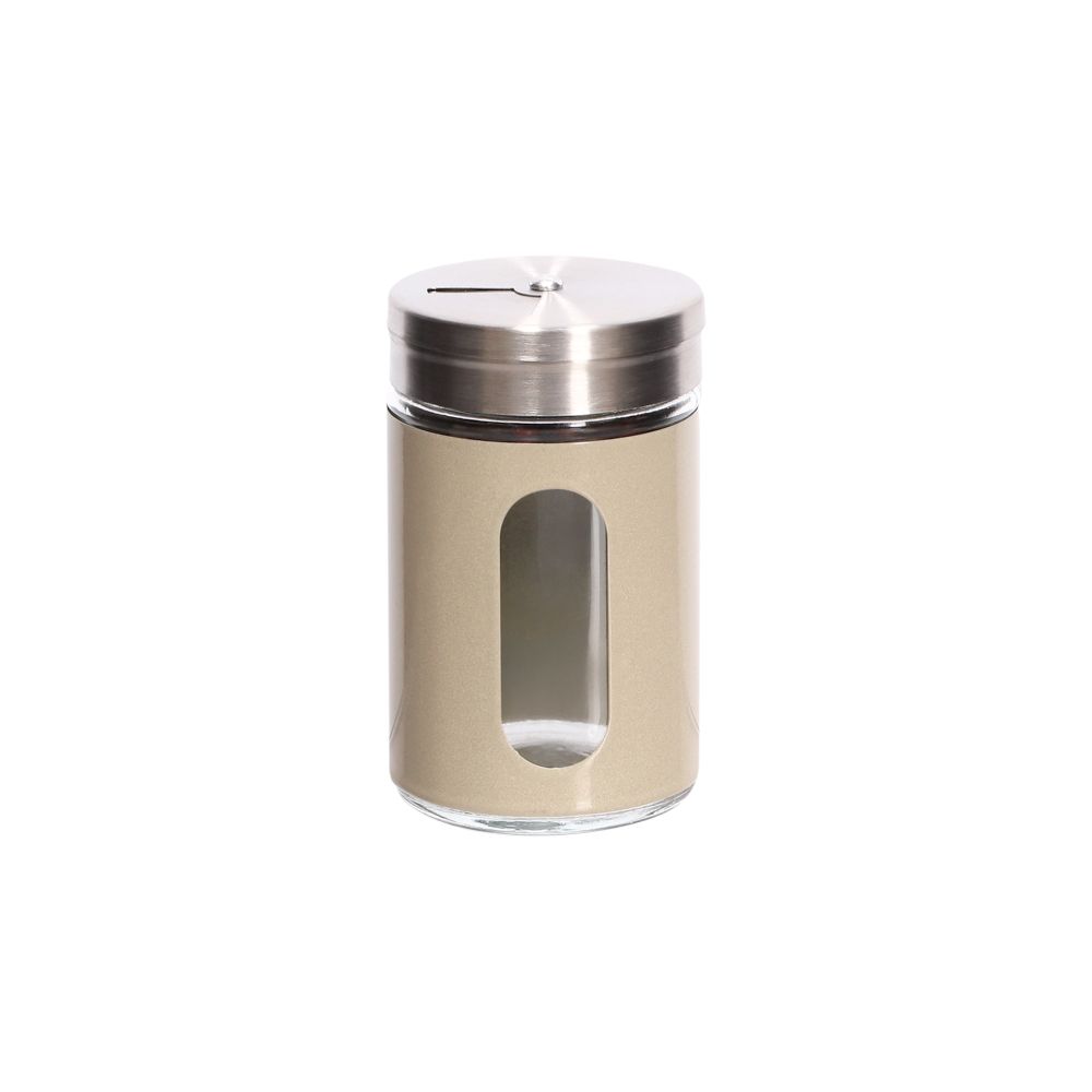 Especiero de vidrio con cubierta y tapa dosificadora de acero inoxidable y cuerpo electropintado.