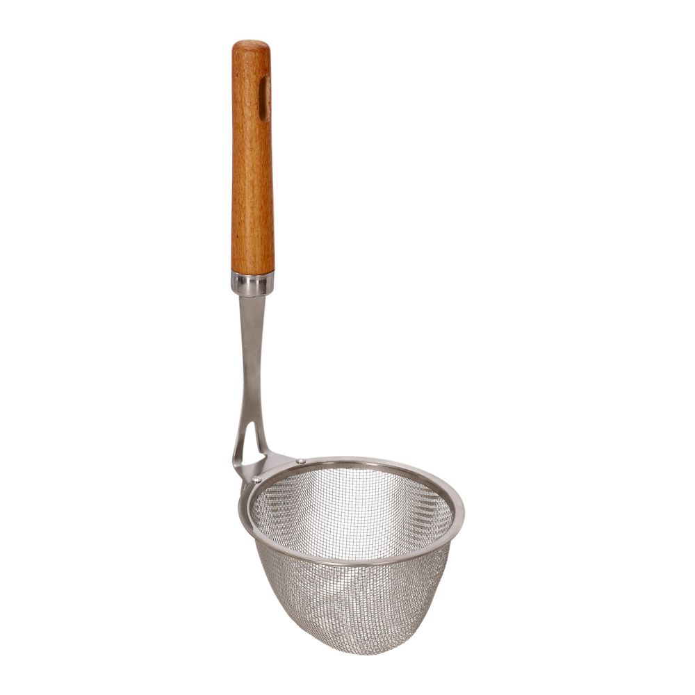 Espumadera de acero inoxidable con malla coladora y mango de madera. Ideal para hacer frituras. Cuenta con un colador con diámetro de 10.8 cm.