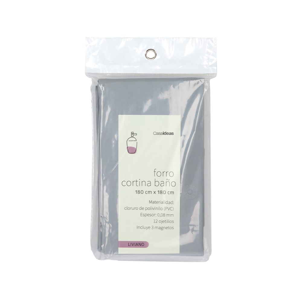 Forro para cortina de baño, liviano y con 12 ojillos. Espesor 0,08 mm. Incluye 3 magnetos. Tipo de Fijación: ojillos PVC. Lavar a mano. No blanquear. No planchar. No usar secadora"
