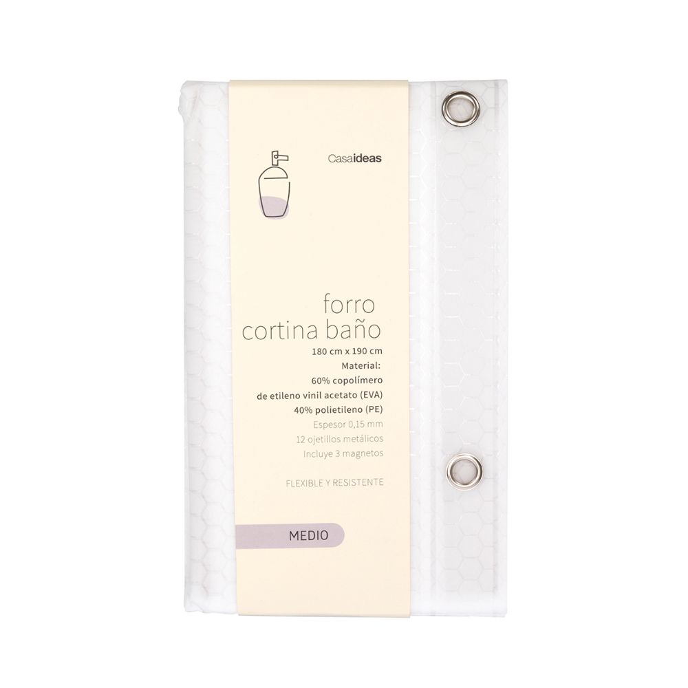 Forro para cortina de baño Plástico con textura, flexible, resistente y con 12 ojillos metálicos. Espesor 0,15 mm. Incluye 3 magnetos. Tipo de fijación: ojillos PVCLavar a mano. No blanquear. No usar secadora. No planchar. No lavar en seco.