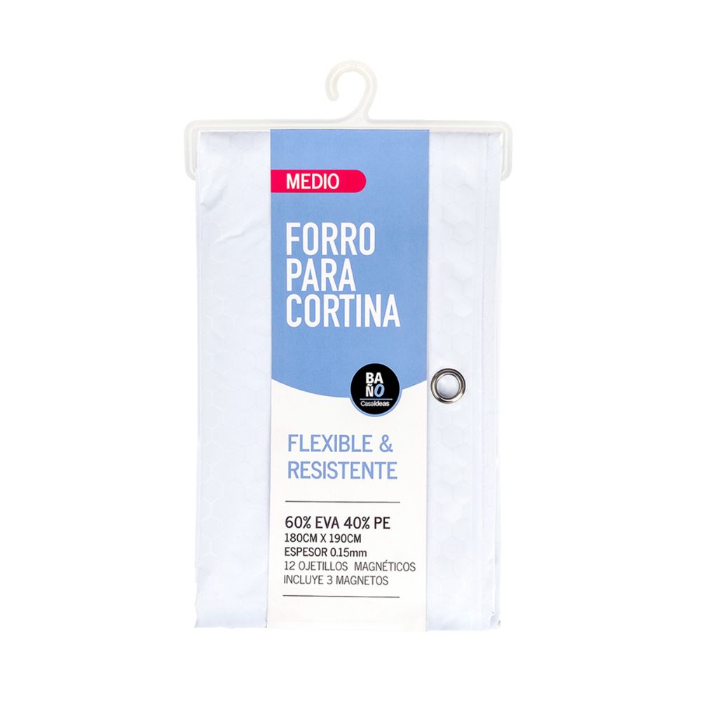 Forro para cortina de baño Plástico con textura, flexible, resistente y con 12 ojillos metálicos. Espesor 0,15 mm. Incluye 3 magnetos. Tipo de fijación: ojillos PVCLavar a mano. No blanquear. No usar secadora. No planchar. No lavar en seco.