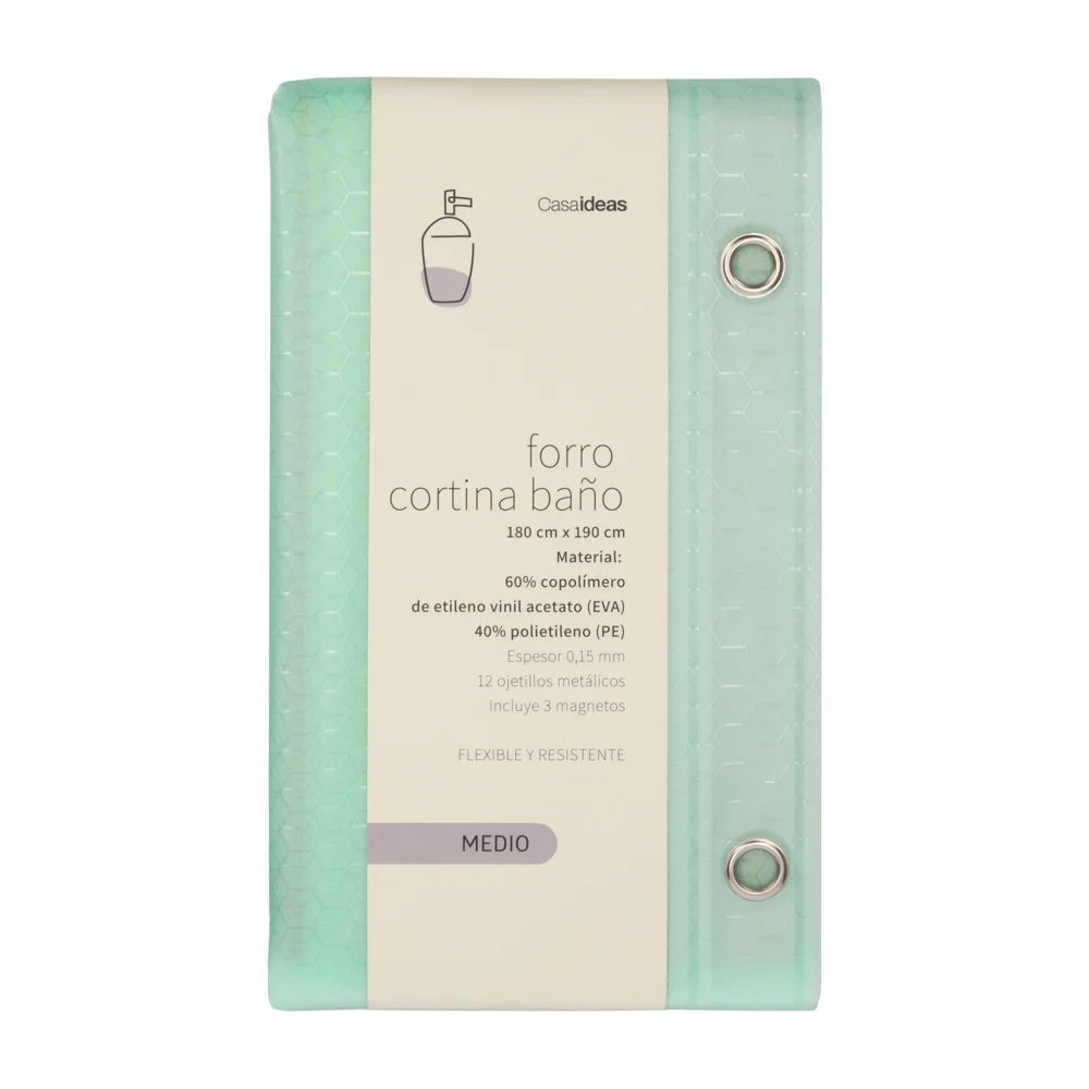Forro para cortina de baño PEVA texturado flexible. resistente y con 12 ojillos. Tiene un espesor 0.08 mm e incluye 3 imánes. Cuenta con fijación por ojillos. Tiene un tamaño de 180x190 cm. Lavar a mano. No blanquear. No planchar. No usar secadora.