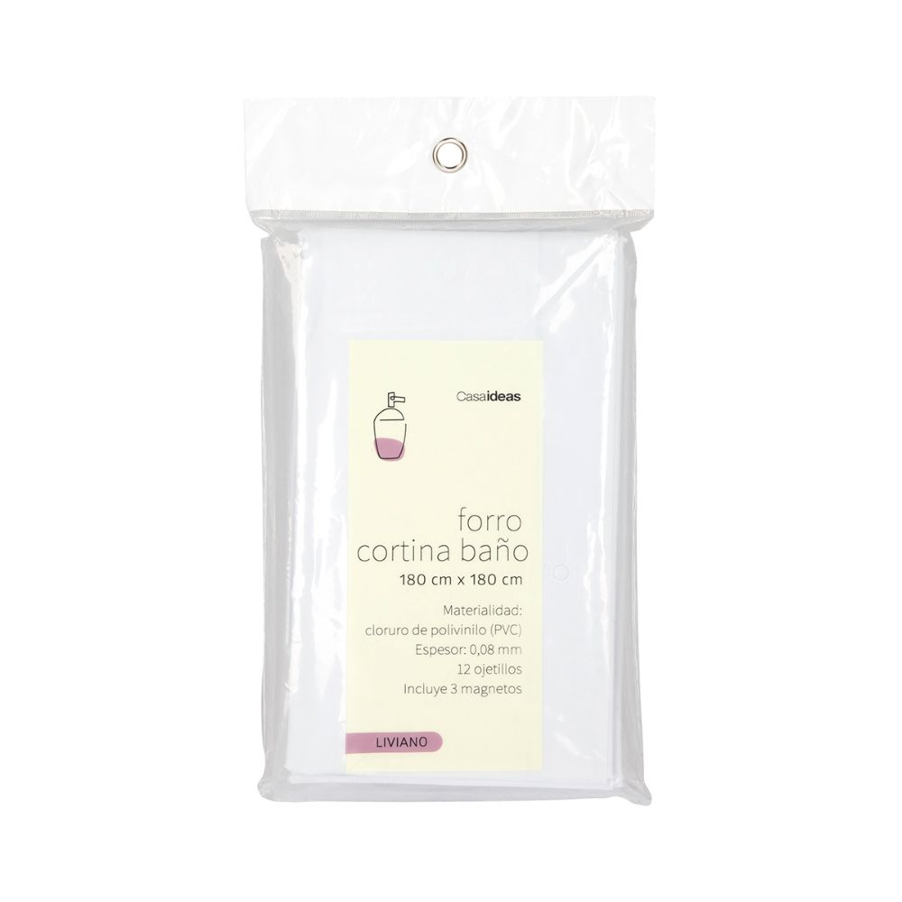 Forro para cortina de baño, liviano y con 12 ojillos. Espesor 0,08 mm. Incluye 3 magnetos.Tipo de Fijación: ojillos PVC. Lavar a mano. No blanquear. No usar secadora. No planchar. No lavar en seco."