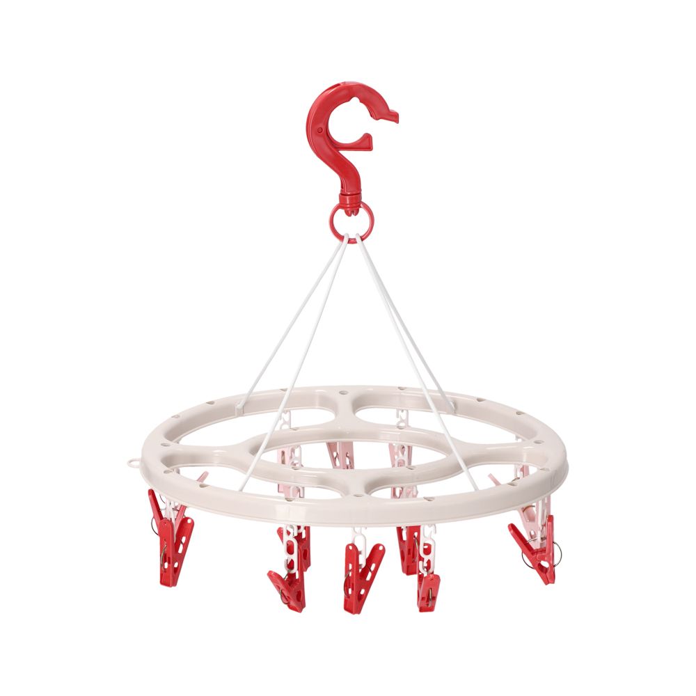Gancho de ropa con 16 pinzas de plástico y acero. Tiene un tamaño de 30x30 cm