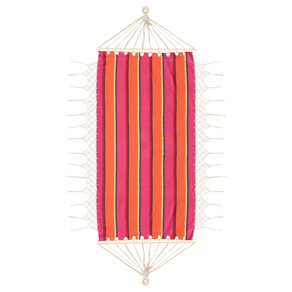 Hamaca con flecos decorativos. Tiene un tamaño de 100x200 cm. Soporta una carga máxima de 100 kg.