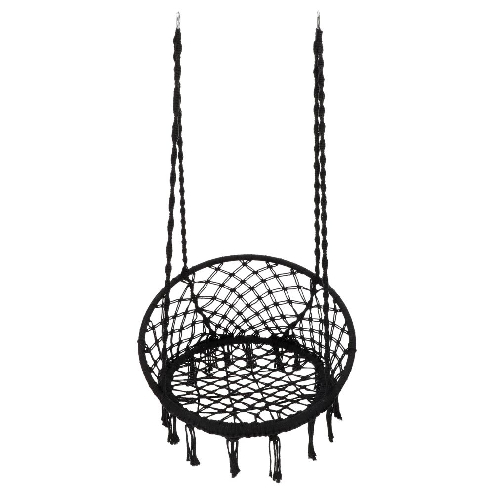Hamaca tipo silla de tejido macramé con hilos de algodón-poliéster, estructura metálica y anillo para colgar. Soporta una carga máxima de 120 kg. Tiene un tamaño de 80x60x1100 cm.