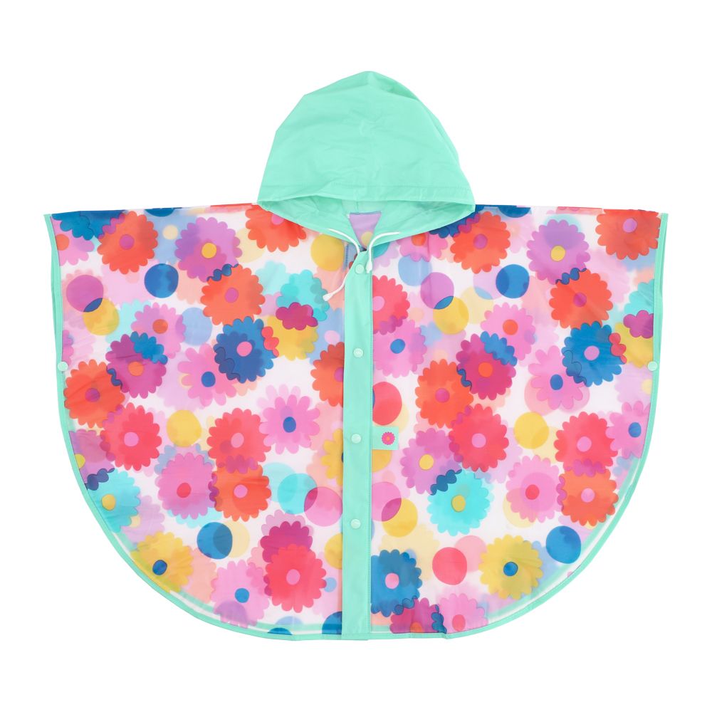 Impermeable poncho con capucha y diseño estampado.