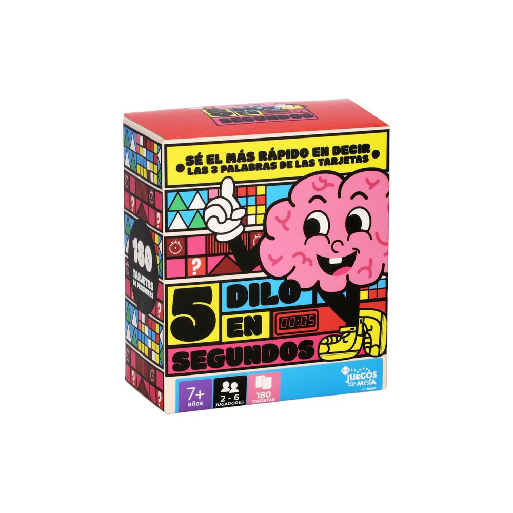 Juego “Dilo en 5 Segundos”. Entretenido juego donde debes ser el más rápido en decir las tres palabras de la tarjeta. Puede jugarse con de 2 a 6 personas. Contiene 180 tarjetas, 1 reloj de arena, 1 caja para las tarjetas e instrucciones de juego. Ideal para mayores de 7 años.
