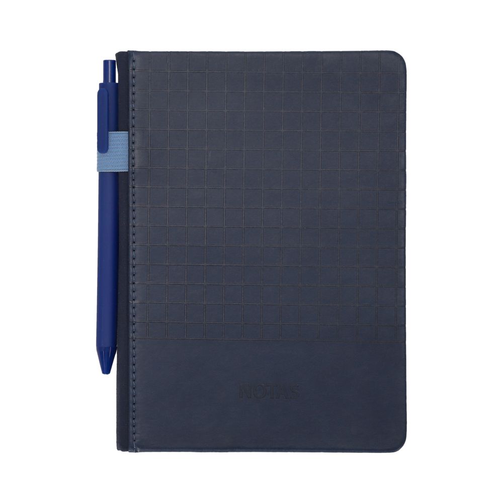 Libreta para composición que incluye elástico y bolígrafo con tinta negra.