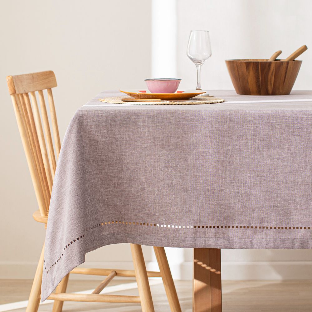 Mantel de poliéster con diseño prepicado en el borde.