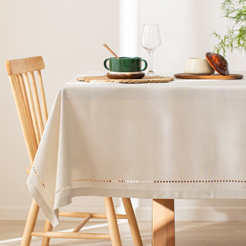 Mantel de poliéster con diseño prepicado en el borde.