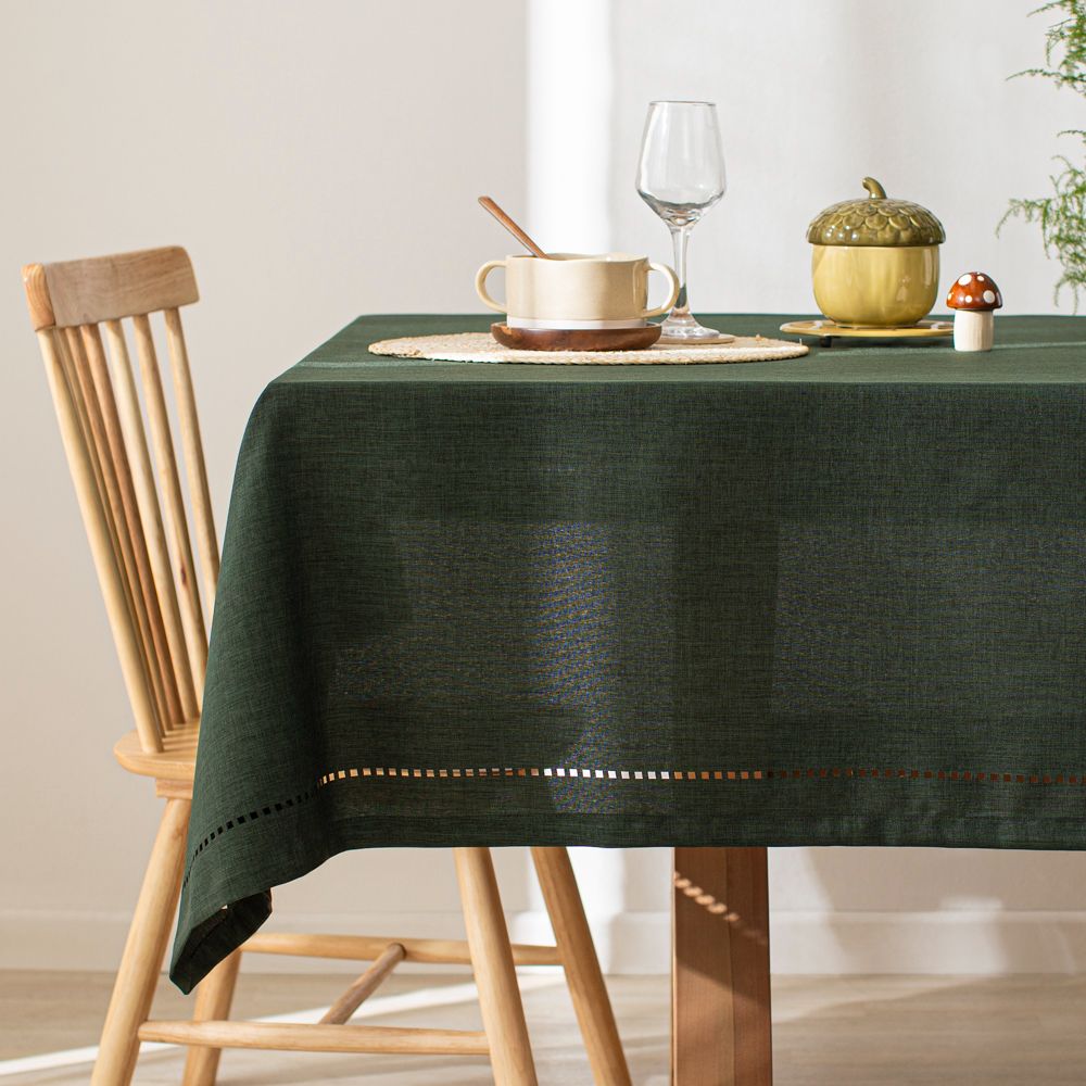 Mantel de poliéster con diseño prepicado en el borde.