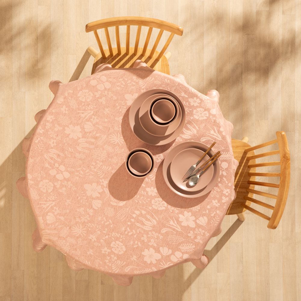 Mantel de poliéster y lino con tejido textura jacquard. Producto disponible en 3 medidas. Cuenta con certificación Oeko-Tex.