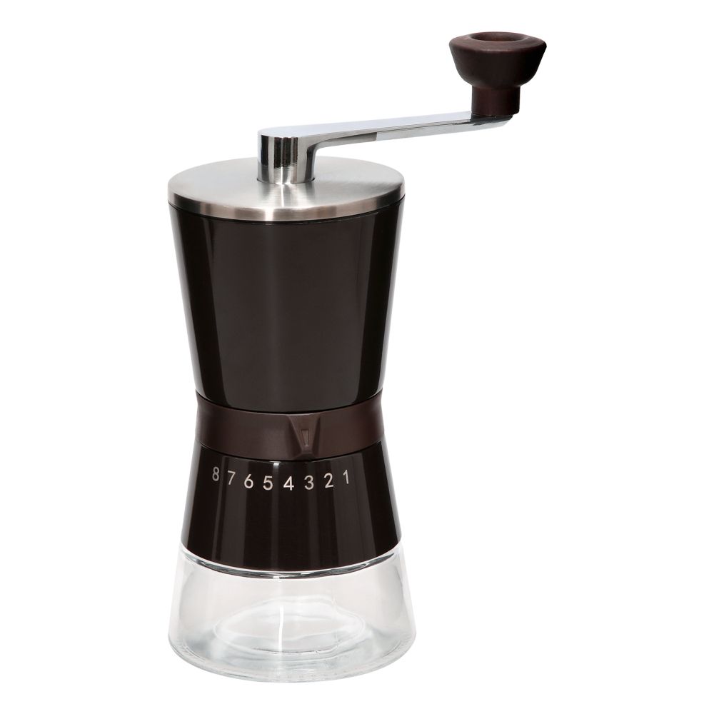 Molinillo manual de acero inoxidable y vidrio para café en gramo. Cuenta con un moledor de cerámica y 8 posiciones para variar el grosor del molido. Este producto tiene una capacidad de 300 ml. Tiene un tamaño de 9x18x21 cm. Lavar a mano y secar de inmediato. No apto para lavavajillas.
