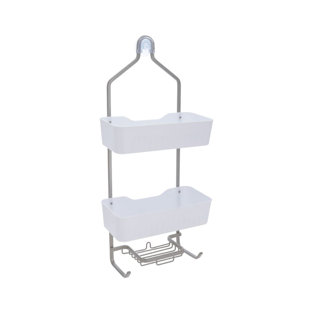 Organizador de Baño de aluminio-plástico con gancho, jabonera y dos canastas de plástico para guardar tus accesorios y productos de baño. Tiene un tamaño de 28x12x63 cm.