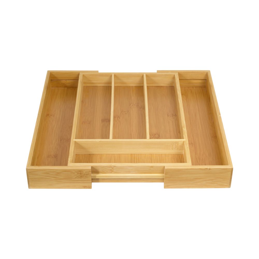 Organizador de cubiertos extensible de bambú para cajones con mayor tamaño. Medida máxima: 26-39x36x5 cm. Limpiar con paño húmedo