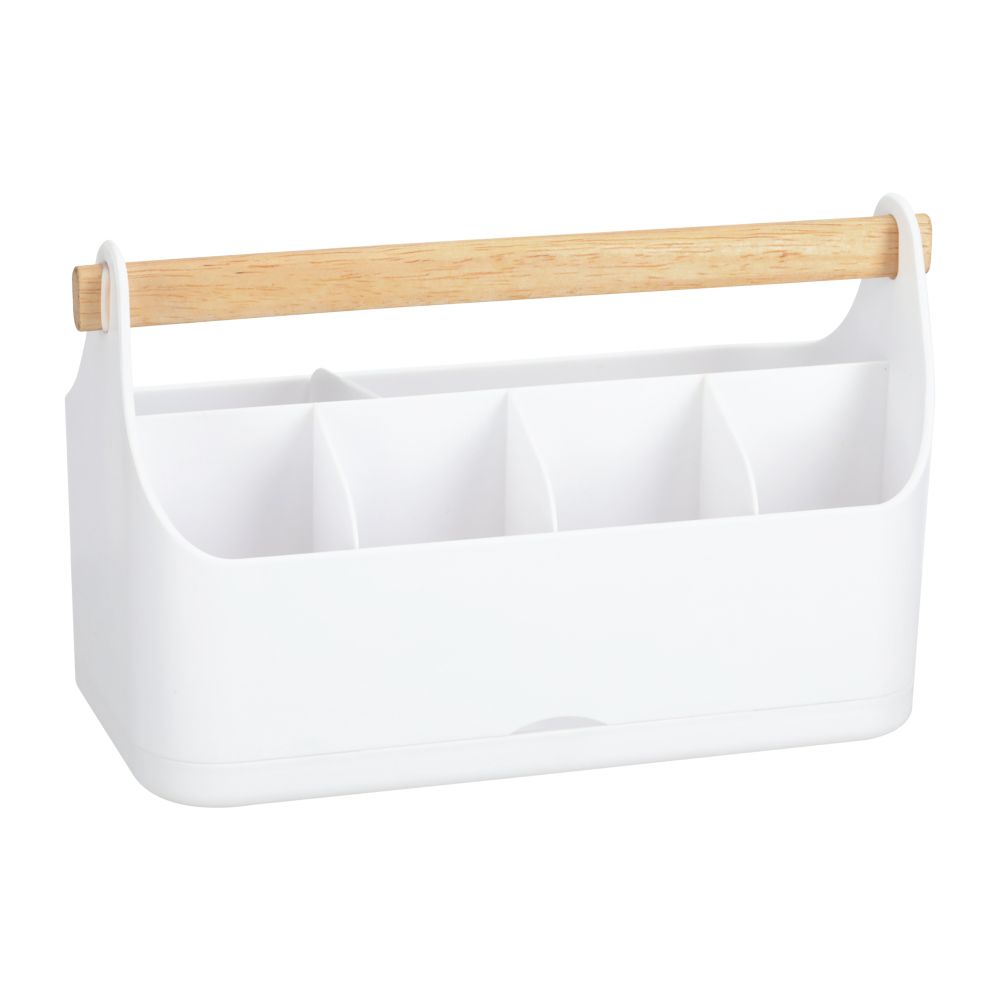 Organizador de cosméticos de poliestireno de alto impacto con compartimientos y resistente asa de madera de caucho. Para una mejor limpieza del fondo organizador, puedes desprender la base y volver a instalarla. Este producto cuenta con medidas de 26x12.3x14 cm.