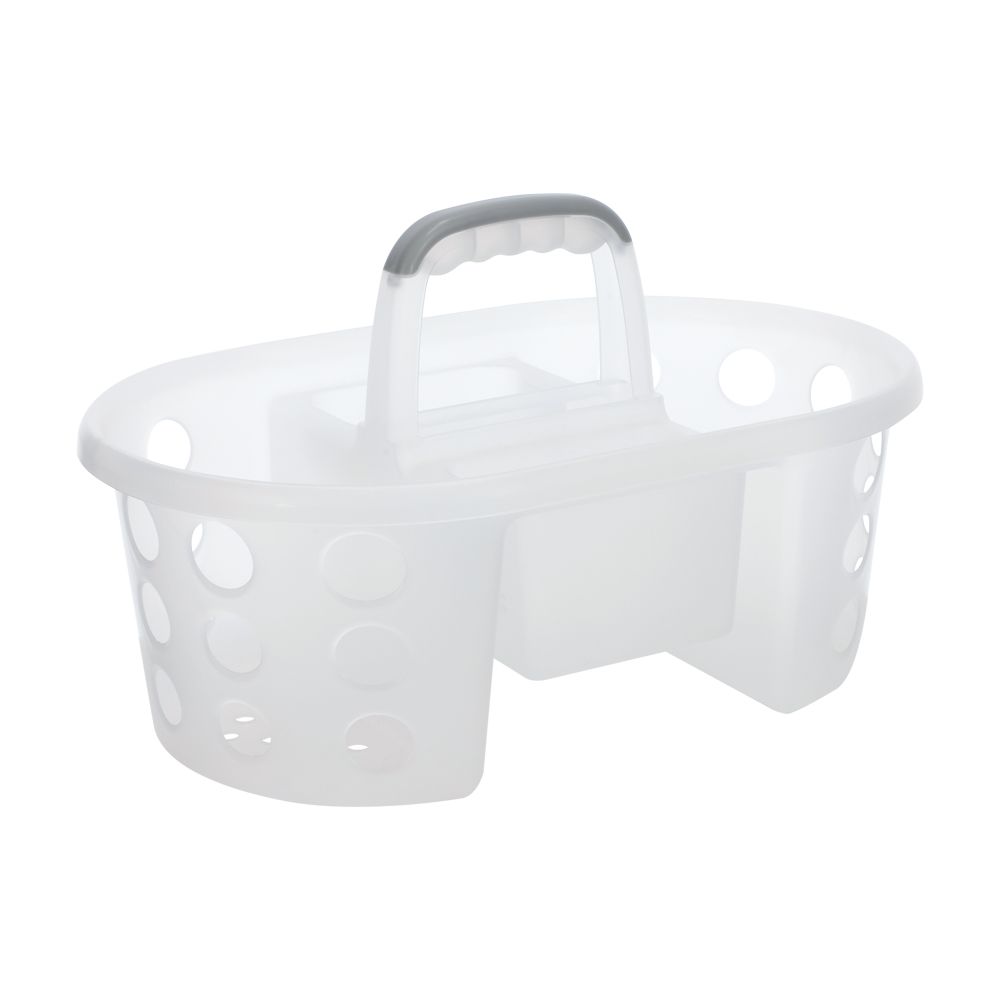 Organizador de plástico para productos para el aseo. Ideal para organizar y transportar productos de limpieza. Cuenta con mango para más comodidad y llevar los productos de un lado para otro.