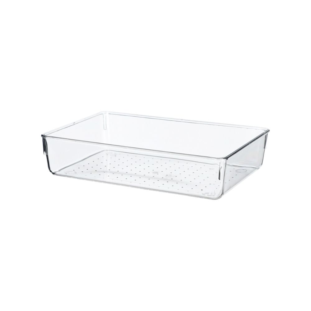 Organizador de cajón de plástico PET transparente. Combínalo con nuestra colección de organizadores para cajón modulares. Tiene un tamaño de 23x15.3x5.6 cm. Lavar con detergente suave.
