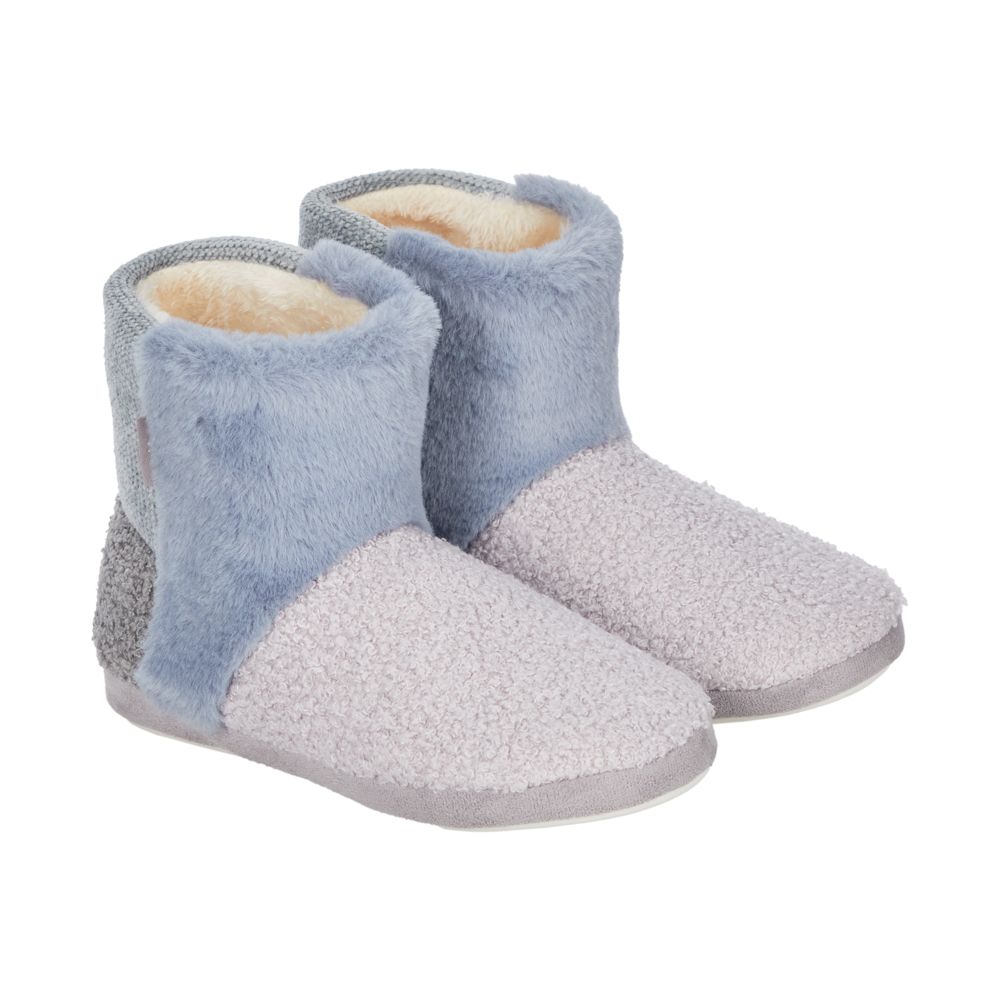 Pantufla tipo bota con tela peluda con suela de poliéster y lindo diseño. Disponible en 3 tallas. Cuenta con certificación Oeko-Tex.