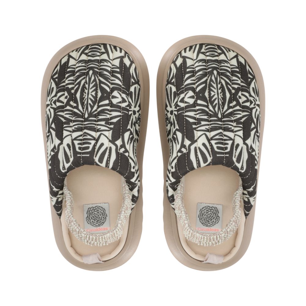 Pantuflas con diseño estampado, suave interior, amarre en el tobillo y suela de TPR. Ideales para estar en casa.