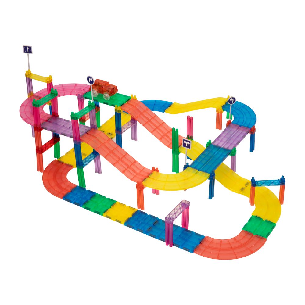 Pista magnética armable con auto con luces que se puede mover por la pista. Incluye 8 señales del tránsito. Este producto es ideal para que los niños desarrollen habilidades como inteligencia espacial, pensamiento lógico, coordinación ojo-mano y creatividad. Ideal para mayores de 3 años. Tiene un total de 101 piezas.