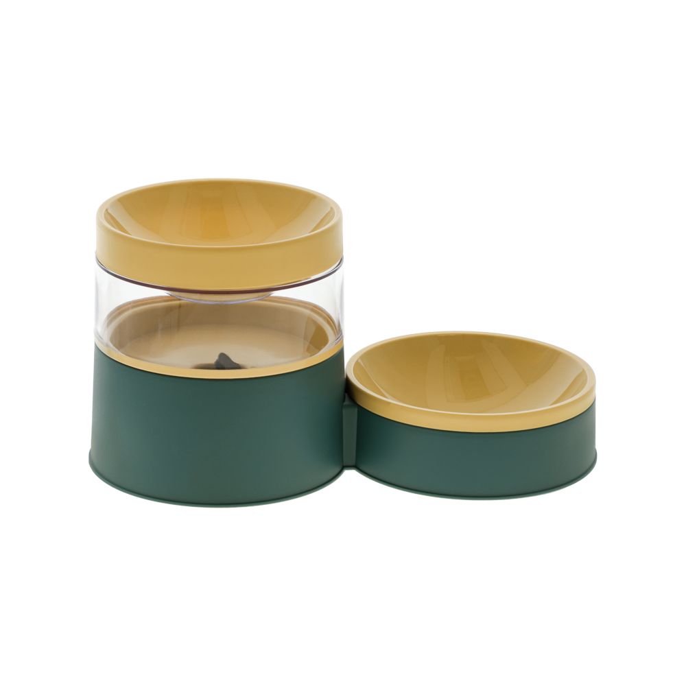Plato de gato para mascotas. Consta de 1 depósito de agua. 1 bowl de agua. 1 bowl de comida. Lavar con detergente suave.