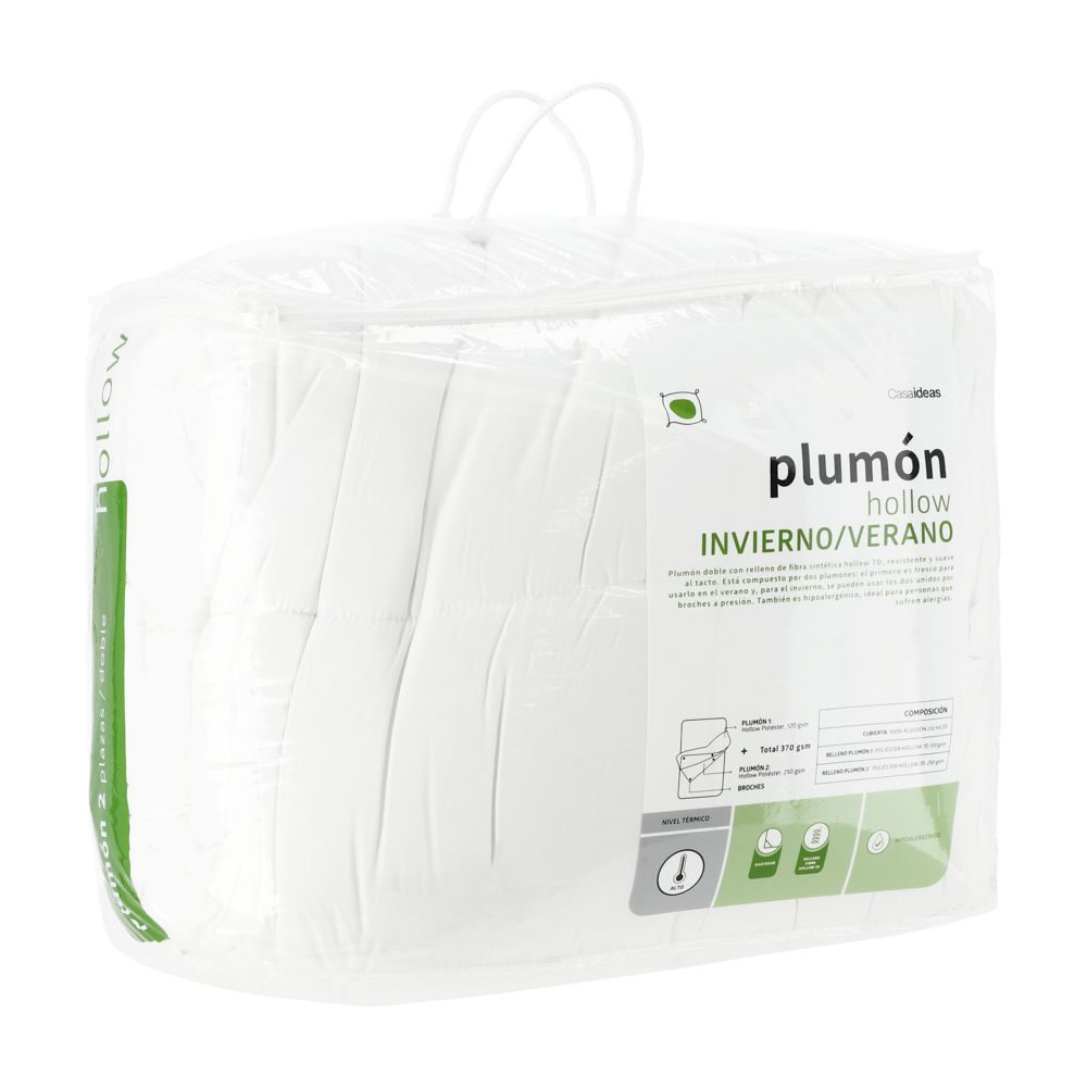 Plumones con cubierta y relleno de microfibra, resistente y suave al tacto. El relleno de microfibra del plumón doble se puede adaptar durante todo el año. En invierno usa los dos plumones unidos por botones a presión para mayor abrigo y en verano utiliza solo uno para mayor frescura. También es hipoalergénico, por lo que es ideal para personas que sufren alergias. Cuenta con certificación Oeko-Tex.