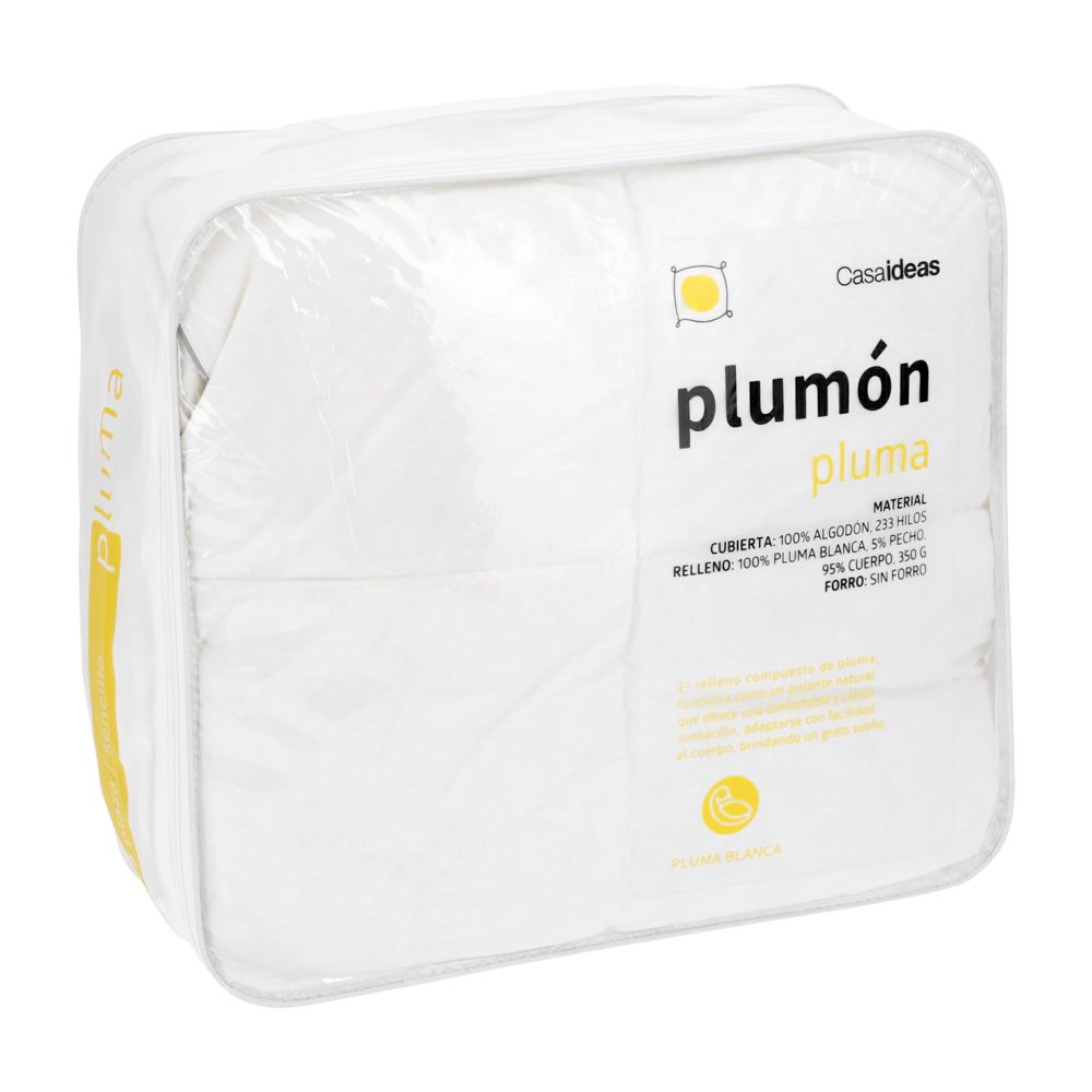 Plumón con cubierta de algodón, 233 hilos y relleno con pluma blanca 95% cuerpo, 5% pecho. El relleno compuesto de pluma funciona como un aislante natural que ofrece una confortable y cálida sensación, adaptándose con facilidad al cuerpo y brindando un grato sueño. Se caracteriza por ser higroscópica, absorbe la humedad y la expulsa hacia el exterior, manteniendo el cuerpo fresco a una temperatura óptima. Su cubierta de algodón previene la pérdida de plumas. Producto disponible en tres medidas. Cuenta con certificación Oeko-Tex. Lavar a máquina con agua a 30°C. No blanquear. No usar secadora. Planchar a temperatura baja. No lavar en seco.