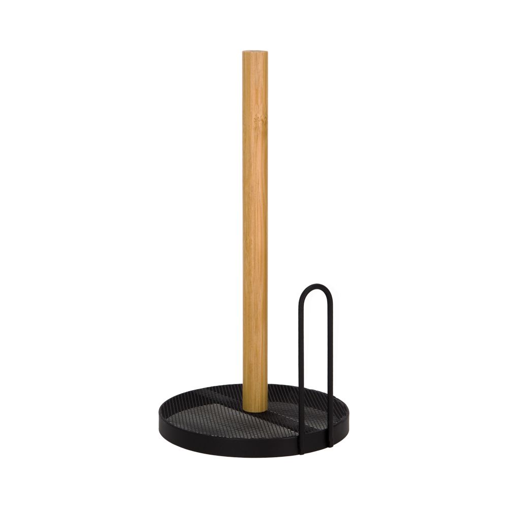 Porta rollo papel absorbente de metal con madera. Tiene un tamaño de 15.8x15x35 cm.