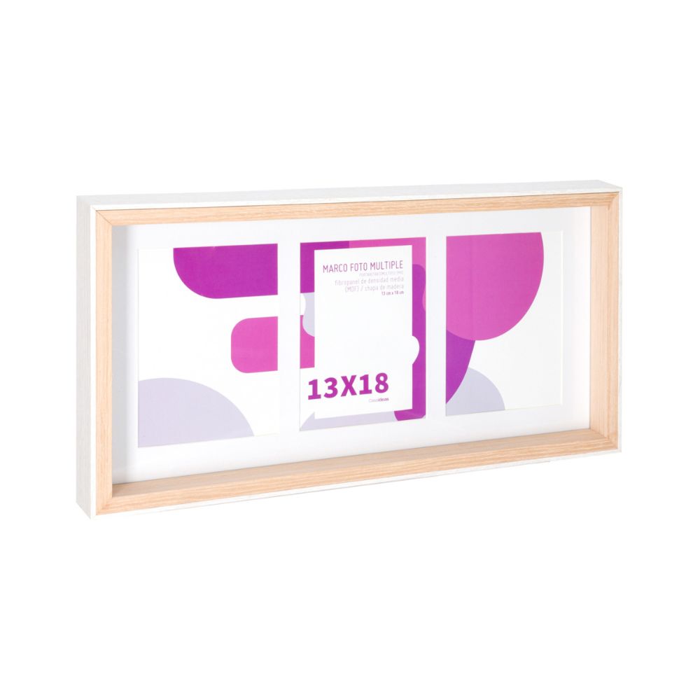 Portarretrato en color blanco. Ideal para poner 3 fotos de 13X18 cm. Limpiar con un paño húmedo.