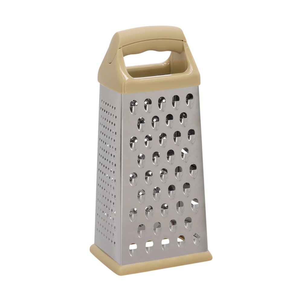 Rallador de acero inoxidable con cómodo mango de plástico y base de silicona antideslizante. Contiene 4 lados con ralladores diferentes (Fino. Grueso. Pica. Rebana). Tiene un tamaño de 10.4x8x21.8 cm.