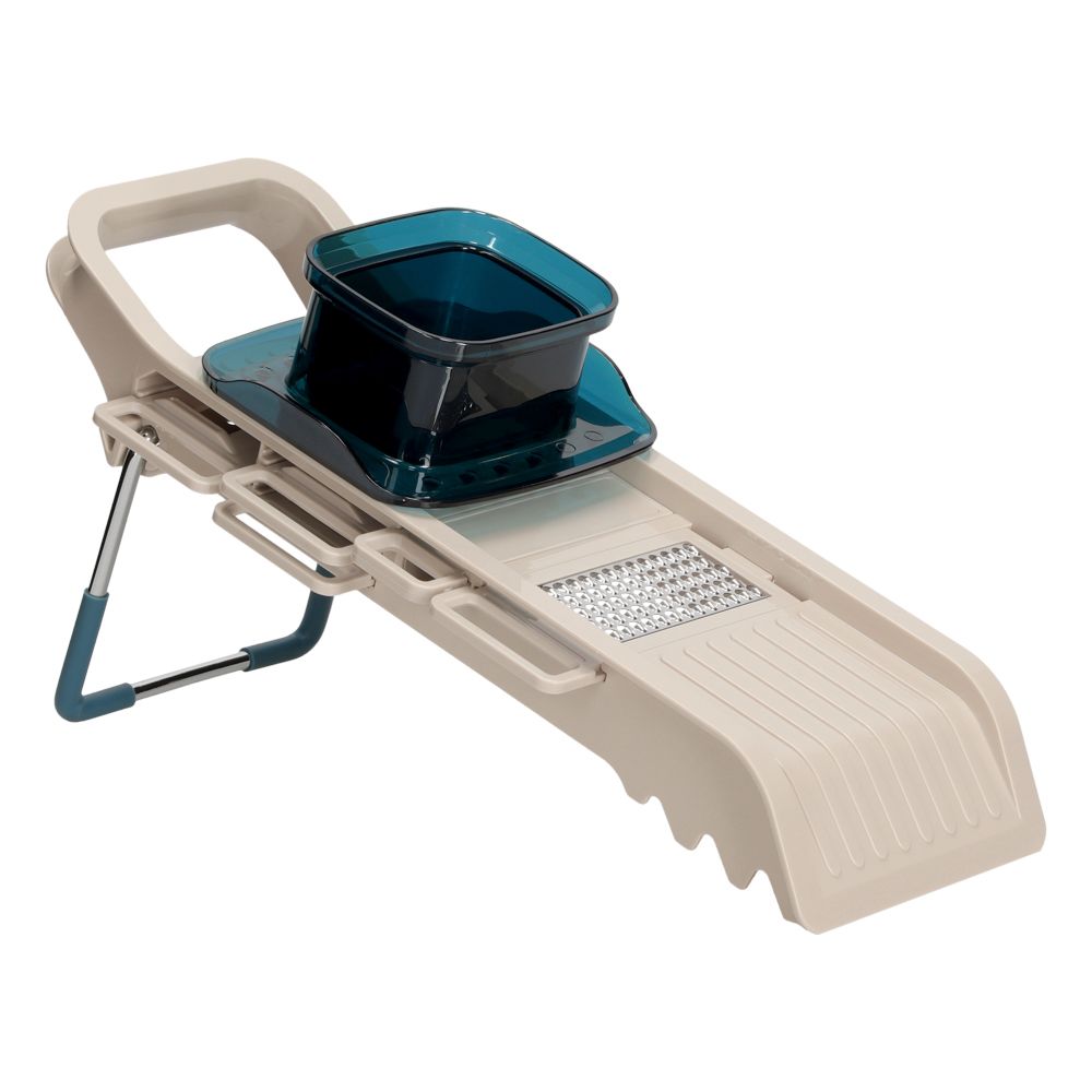 Mandolina con 5 tipos de cortes y guía de alimentos. Contiene: rallador moledor, rallador fino, rallador grueso, corte plano, corte juliana, guía de alimentos, puedes guardar las cuchillas en el mismo producto. Tiene un tamaño de 31.1x12.6x17.6 cm. Apto para lavavajillas.