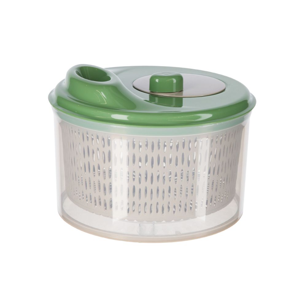 Secador de plástico transparente tipo centrífuga para vegetales. es ideal para eliminar el exceso de agua y secar rápidamente verduras y frutas. tiene un diámetro de 24x16.5cm.