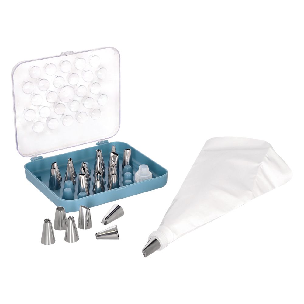 Set de 24 boquillas de acero inoxidable para decorar repostería. Contiene instrucciones de uso.