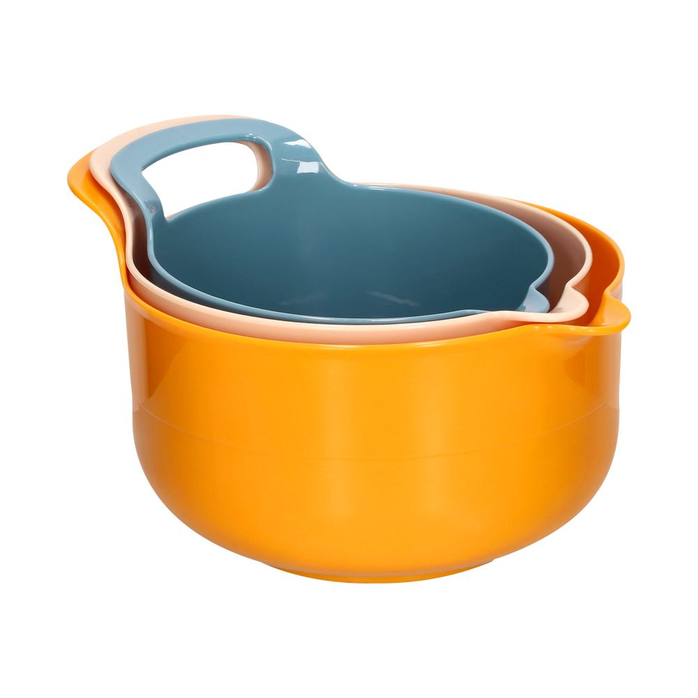 Set de 3 bowls para utilizar al hacer repostería. Tienen base antideslizante y se guardan adentro del otro para acomodar en espacios pequeños.