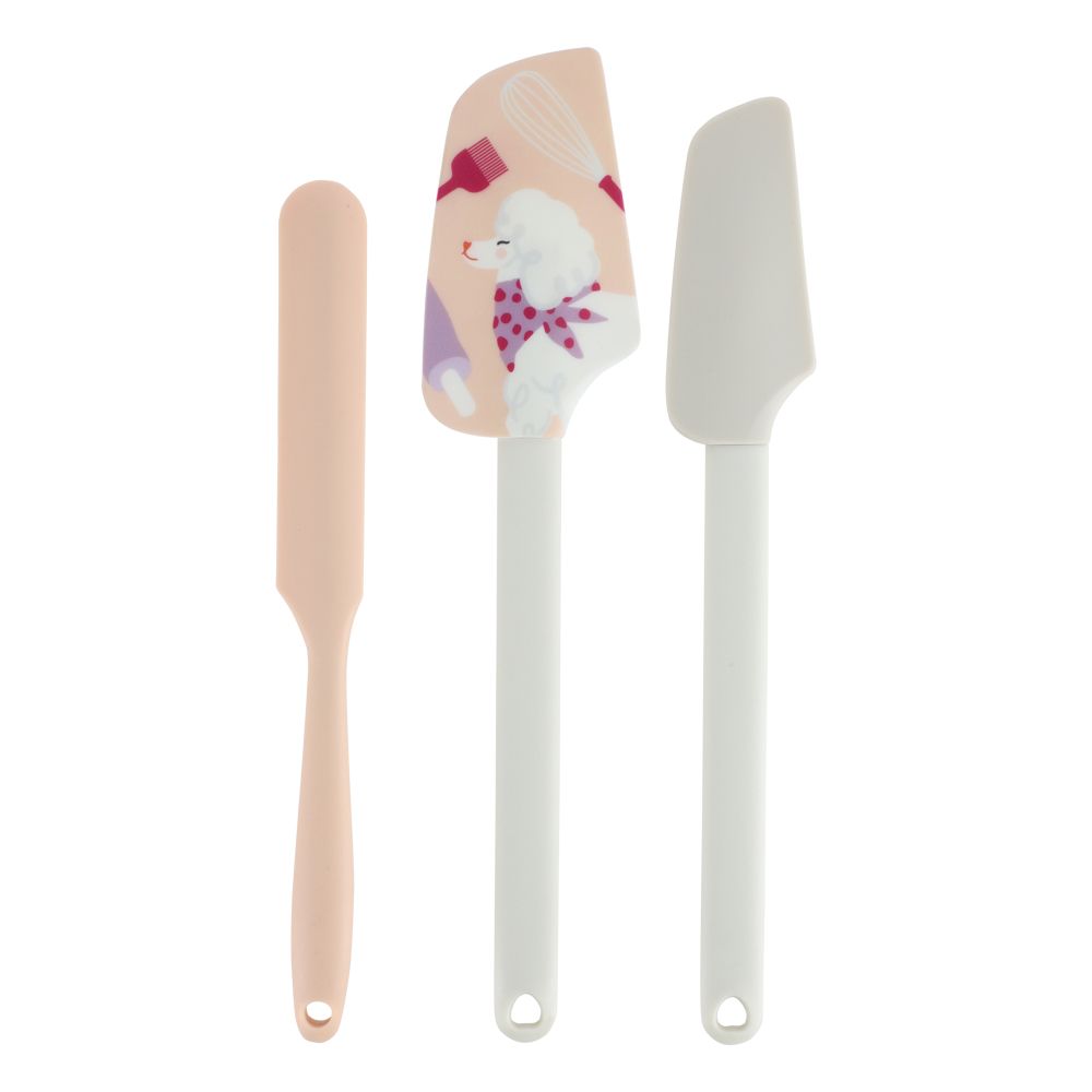Set 3 espátulas de silicona con mango de plástico con diseño estampado. Tienen un tamaño de 2.5x1.1x24.4 cm, 4.3x1x27.7 cm y 4x0.9x24.4 cm respectivamente.