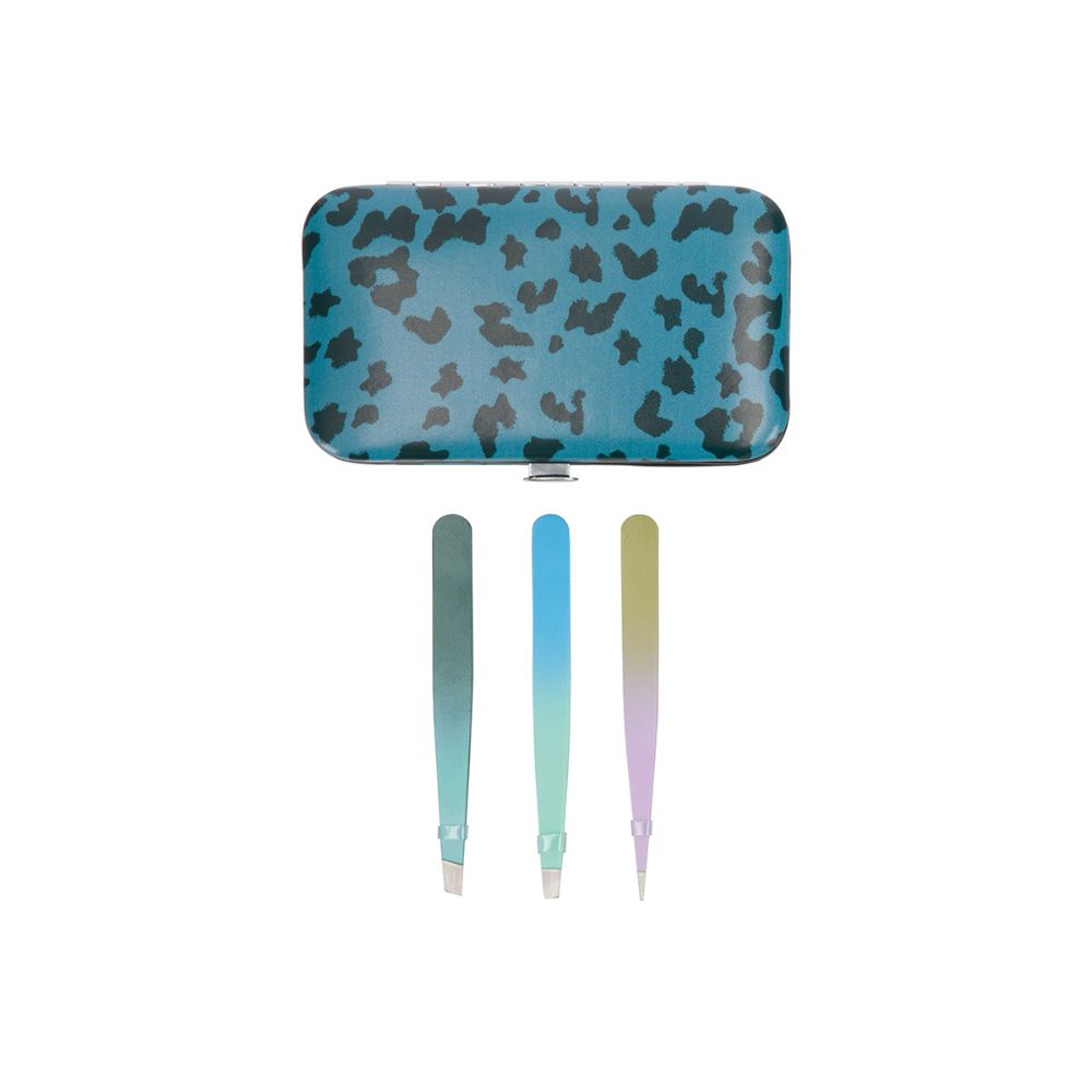 Set de estuche organizador con espejo y tres pinzas. ideal para llevar en la cartera. incluye: pinzas con punta recta. biselada y delgada.