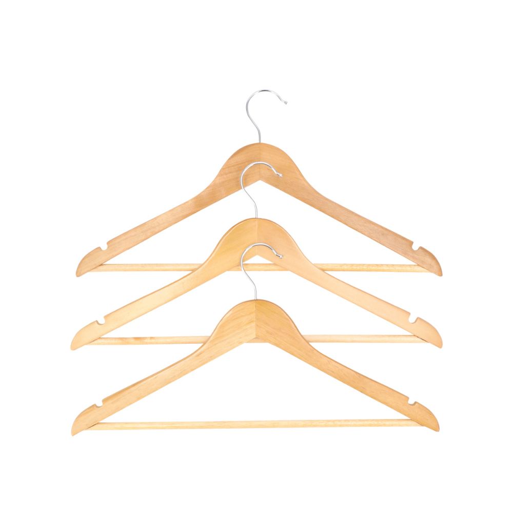 Set de 3 Ganchos de ropa de madera con gancho de metal. Limpiar con paño húmedo.