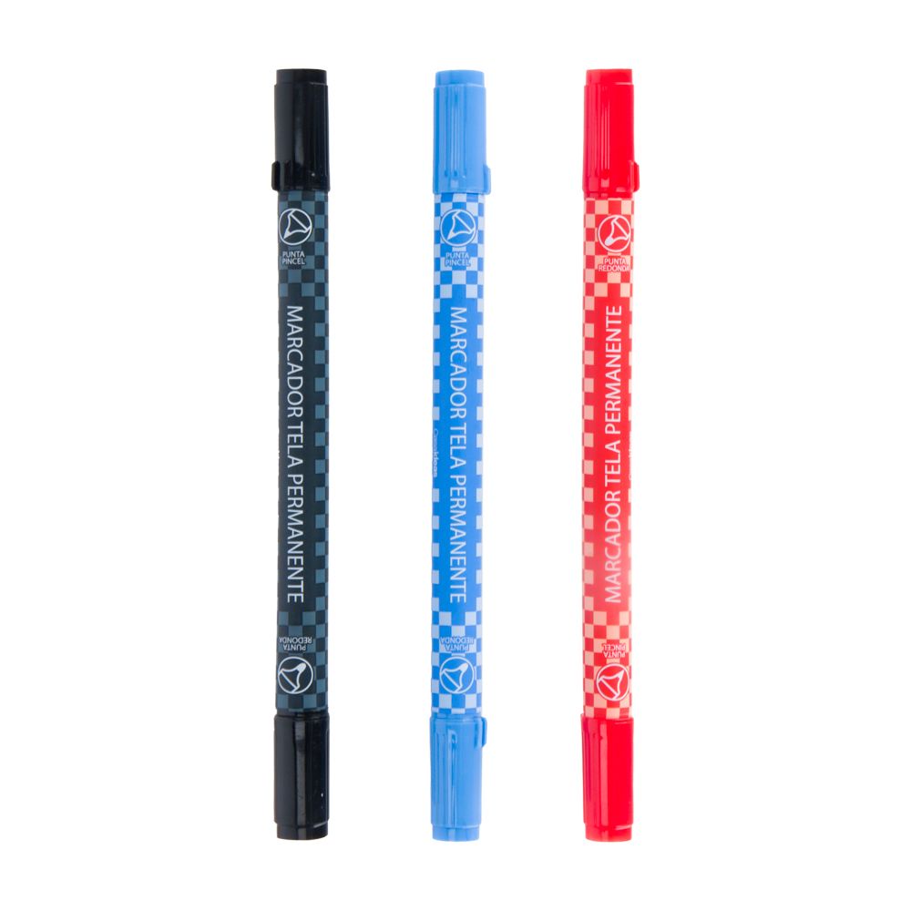 Set 3 marcadores permanentes para tela con doble punta (punta tipo pincel y punta redonda). Incluye colores azul, rojo y negro.