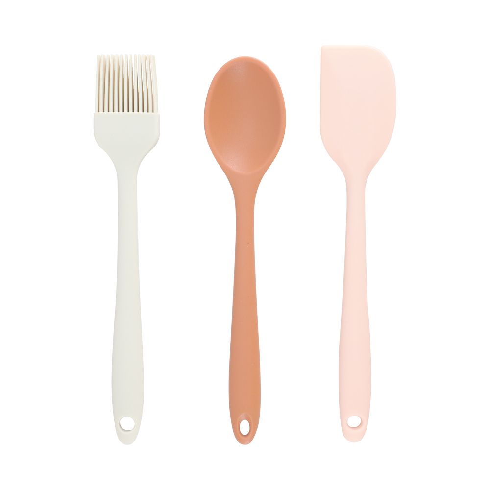 Set 3 mini espátulas de silicona para cocinar. Productos aptos para lavavajillas. Incluye: Una cuchara, una espátula y una brocha. Tienen un tamaño de 4.3x21.1 cm.
