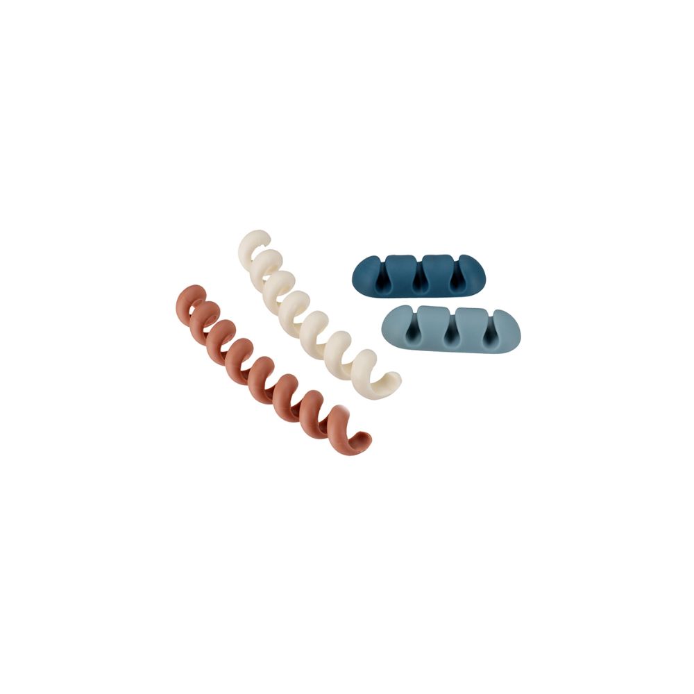 Set de 4 organizadores de cables mixtos. Incluye instrucciones de uso. Forma 1: Ancho 5 cm | Profundidad 2 cm | Alto 1,3 cm Forma 2: Ancho 1,6 cm | profundidad 1,6 cm | Alto 10 cm. Limpiar con paño húmedo.