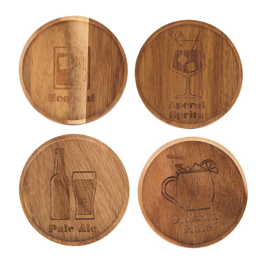 Set de 4 posavasos de madera de acacia. Tienen un diámetro de 10 cm.