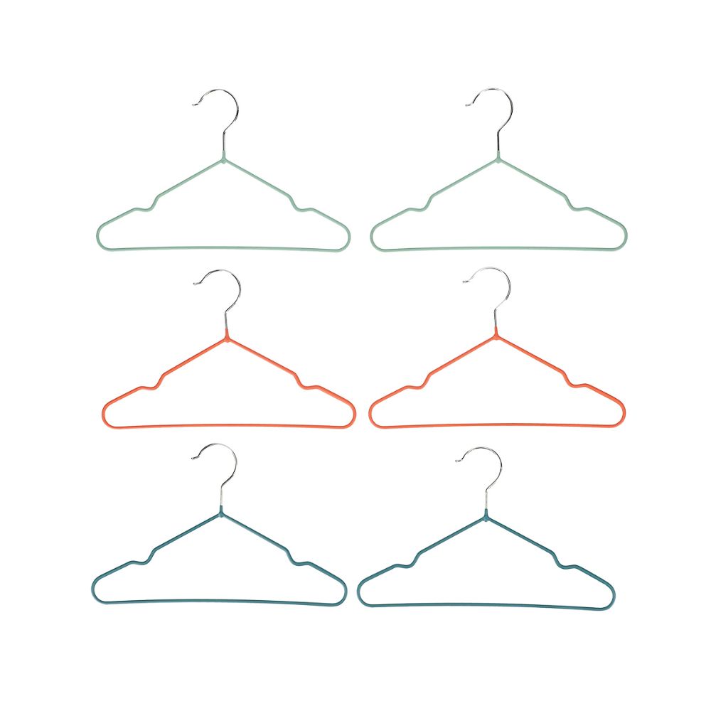 Set de 6 ganchos de ropa de metal con cubierta antideslizante para niños. Tienen un tamaño de 30x34x18.5 cm. Limpiar con paño húmedo.