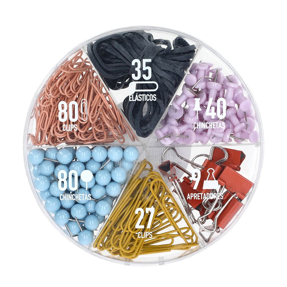 Caja redonda con set de accesorios para ocupar escritorio. Incluye: 35 elásticos, 80 clip chicos, 80 push pin redondo, 9 binderclip, 27 clip grandes, 40 push pin.