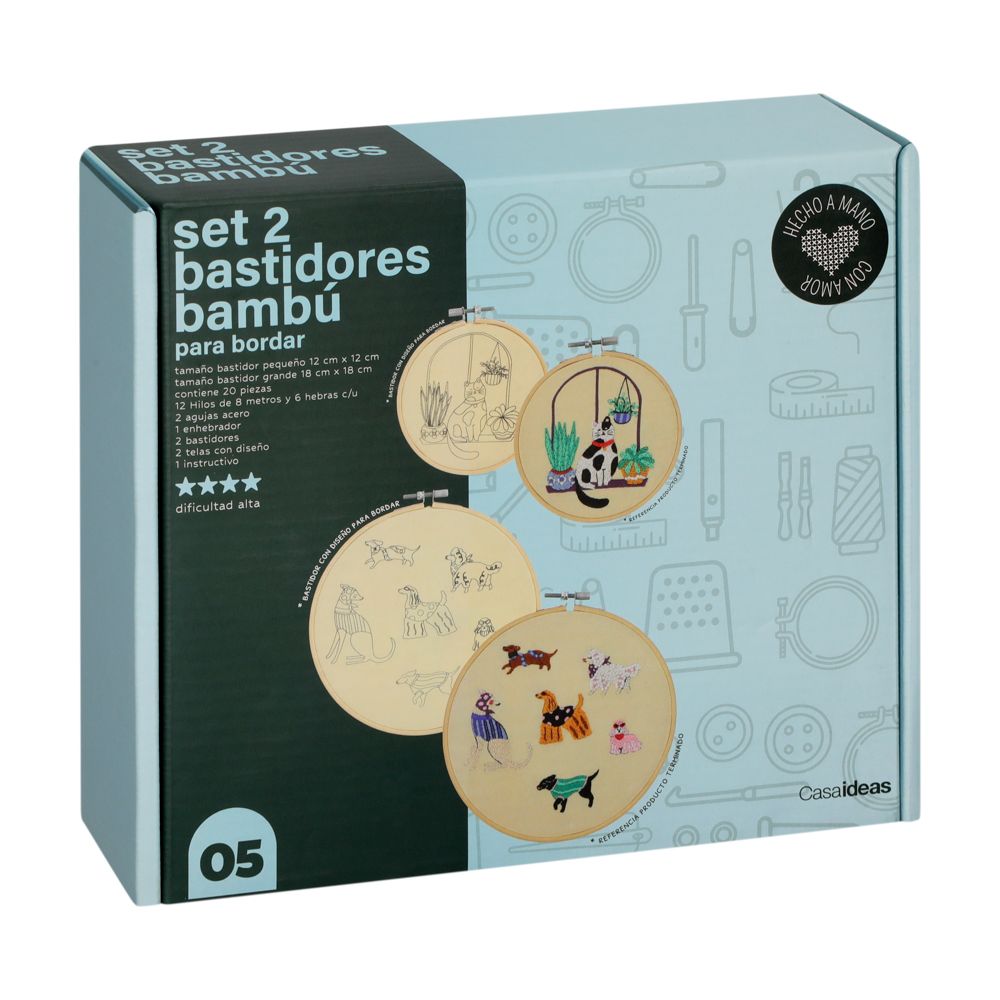 Set de 2 bastidores de bambú con diseño impreso y materiales para bordar. Producto con dificultad media. Tienen un tamaño de 12x12 y 18x18 cm